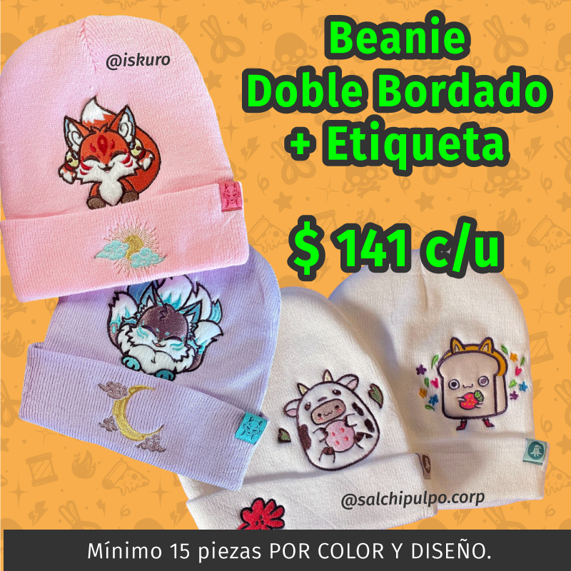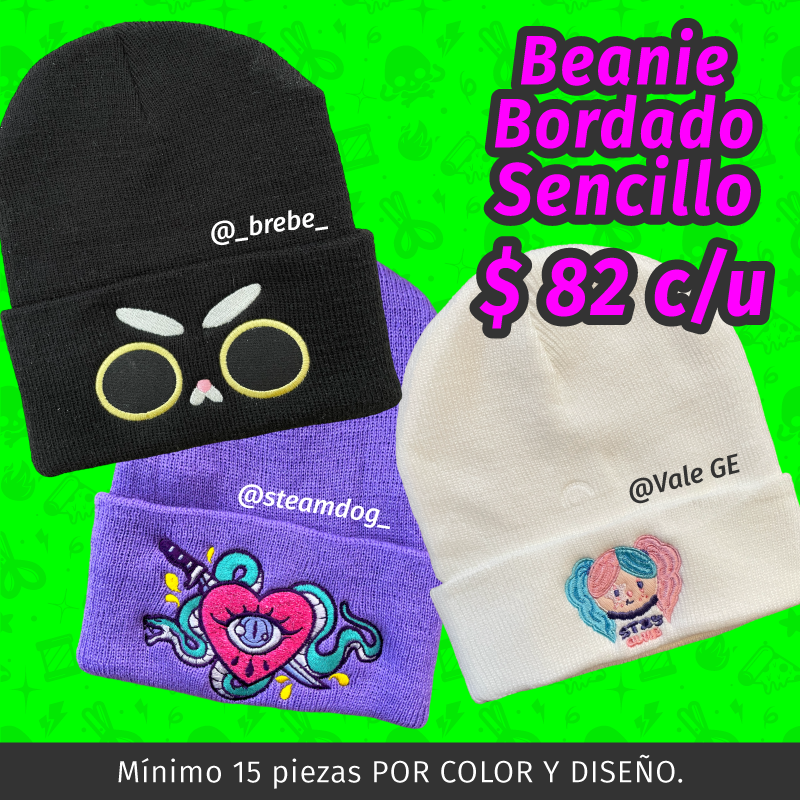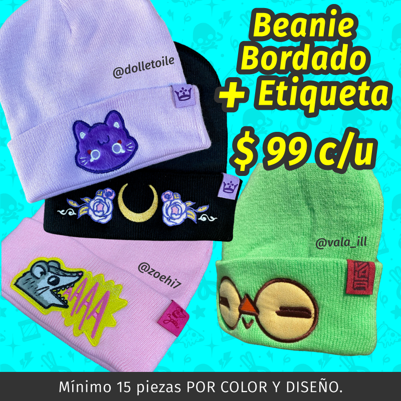 El mínimo son 15 piezas DEL MISMO DISEÑO Y COLOR DE BEANIE.